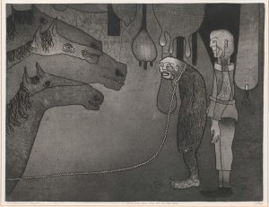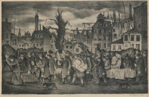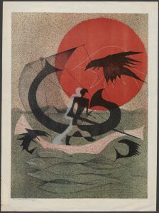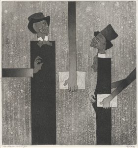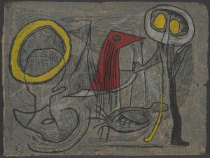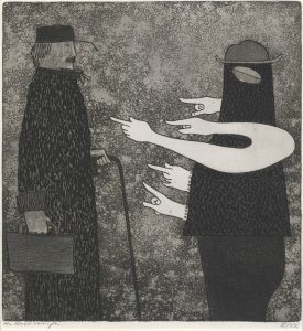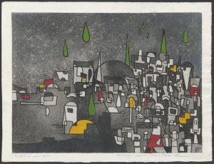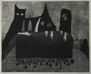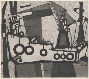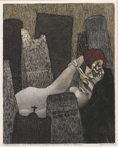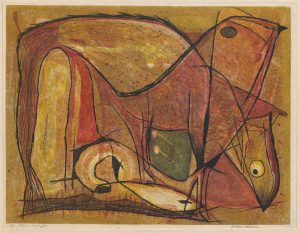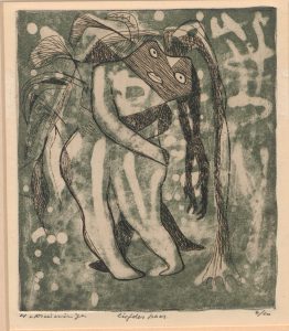De slang rooft het levenskruid, 1963 Ets op papier 30,5 x 37,5 cm (Gilgamesj epos), particuliere collectie © foto Ulco Janssen [Vrouwen veranderen in parelhoenders], 1956 Kleurenlitho op papier 33,5 x 23,5 cm ([Metamorphosen?]), particuliere collectie © foto MicroFormat [De vernietigende werking van ultraviolet licht op de aggregaten van DNA en eiwit], 1977 Kleurenets op papier 32,5 x 44 cm (Ontstaan van het leven; nr. 6 van 24), particuliere collectie © foto Ulco Janssen Homoseksueel gedrag van de manlijke gameten van het wier chlamydomonas, 1986 Kleurenets op papier 33 x 39 cm (Ontstaan van de seksualiteit), particuliere collectie © foto Ulco Janssen [Medusa], 1985 Kleurenets op papier 37 x 49 cm (Evolutie), particuliere collectie © foto Ulco Janssen [Aquarium], 1940 Litho op papier 24 x 19,3 cm, particuliere collectie [Ik zat te pruilen…], 1972 Ets-aquatint op papier 27,5 x 25,5 cm (Twee en twintig etsen bij minnebrieven van een Franc-tireur / Multatuli; nr. 17), particuliere collectie © foto MicroFormat Aan de baar van Enkidu, 1963 Ets op papier 31 x 38 cm (Gilgamesj epos), particuliere collectie © foto Ulco Janssen Midden-Oosten dorpje tegen heuvel, 1966 Kleurenets-aquatint op papier 29 x 39 cm (Reis door ‘t Midden Oosten), particuliere collectie © foto MicroFormat Rudimentaire scheepsvormen, 1975 Ets-aquatint op papier 59,2 x 78,5 cm, particuliere collectie © foto MicroFormat [Gij kunt u niet verschuilen…], 1972 Ets-aquatint op papier, I/XX 27,5 x 25,5 cm (Twee en twintig etsen bij minnebrieven van een Franc-tireur / Multatuli; nr. 18), particuliere collectie © foto MicroFormat Optocht der leprozen, 1975 Ets-aquatint – vernis mou op papier 37 x 94,3 cm (Leven en Willekeur), particuliere collectie © foto MicroFormat Vreemde figuren, 1956 Gemengde techniek (ets op kleurenlitho) 52 x 39 cm, particuliere collectie © foto MicroFormat Vogeldier, 1956 Kleurenlitho op papier 37,5 x 49,2 cm, particuliere collectie © foto MicroFormat [mens en dier], 1960 Kleurenets op lompenpapier 29 x 38 cm, particuliere collectie © foto MicroFormat [Achnaton zonneboot], 1956 Kleurenlitho op papier 44 x 32,4 cm, particuliere collectie © foto MicroFormat [Op de vlucht?], 1939 Litho op papier 46,5 x 31 cm, particuliere collectie © foto MicroFormat [Vluchtelingen], 1940 Litho op papier 31 x 45,1 cm, particuliere collectie © foto MicroFormat Boeienlegger, 1960 Ets op papier 43 x 49 cm (Deltawerken), particuliere collectie © foto MicroFormat 1413 te Amsterdam, verbod prostitutie in kerken en kerkhoven, 1970 Kleurenets op papier 41 x 32,6 cm (Leven en Willekeur; nr. 29 van 33, kleurvariant), particuliere collectie © foto MicroFormat [Ulco als baby], 1939 Litho op papier 14 x 20,3 cm, particuliere collectie © foto MicroFormat 15e eeuwse bordelen, 1970 Kleurenets-aquatint op papier 41 x 32,5 cm (Leven en Willekeur; nr. 30 van 33), particuliere collectie © foto MicroFormat De zwarte kater, 1975 Kleurenets op papier 37,5 x 30,4 cm (Edgar Allan Poe), particuliere collectie © foto MicroFormat Groene kop, 1952 Gemengde techniek (ets op kleurenlitho) 20 x 19,5 cm, particuliere collectie © foto MicroFormat Liefdespaar, 1953 Kleurenlitho op papier 17,9 x 15,2 cm, particuliere collectie © foto MicroFormat Gulliver bij de paarden, 1977 Ets-aquatint – vernis mou op papier 33 x 22,8 cm (Gullivers reizen), particuliere collectie © foto MicroFormat Twee groenwieren closterium, 1977 Kleurenets op papier 14,9 x 19 cm (Ontstaan van het leven), particuliere collectie © foto MicroFormat Watersnood 1953 Zeeland, 1953 Kleurenlitho op papier 20,5 x 25 cm (Watersnoodramp 1953), particuliere collectie © foto MicroFormat Vissersschepen Breskens, 1956 Gemengde techniek (ets op kleurenlitho) 54 x 42,5 cm, particuliere collectie © foto MicroFormat Porphyrine molecuul neemt magnesium in zich op, 1977 Kleurenets-aquatint op papier 33 x 44,2 cm (Ontstaan van het leven; nr. 10 van 24), particuliere collectie © foto MicroFormat bekijk hier Schilderijen of overig werk Schilderijen Bekijk Overig werk Bekijk